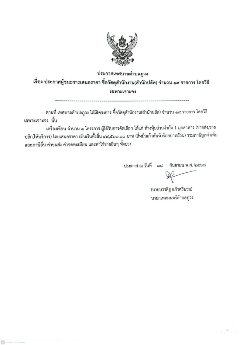 ประกาศผู้ชนะการเสนอราคา ซื้อวัสดุสำนักงาน(สำนักปลัด) จำนวน 19 รายการ