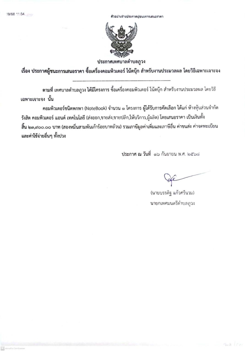 ประกาศผู้ชนะการเสนอราคา ซื้อเครื่องคอมพิวเตอร์ โน๊ตบุ๊ก สำหรับประมวลผล