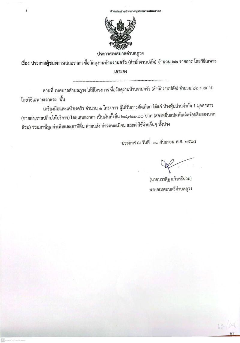 ประกาศผู้ชนะการเสนอราคา ซื้อวัสดุงานบ้านงานครัว (สำนักปลัด) จำนวน 22 รายการ