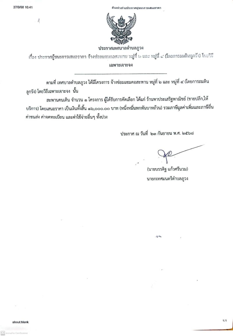ประกาศผู้ชนะการเสนอราคา จ้างซ่อมแซมคอสะพาน หมู่ที่ 2 หมู่ที่ 4 (โดยการถมดินลูกรัง)
