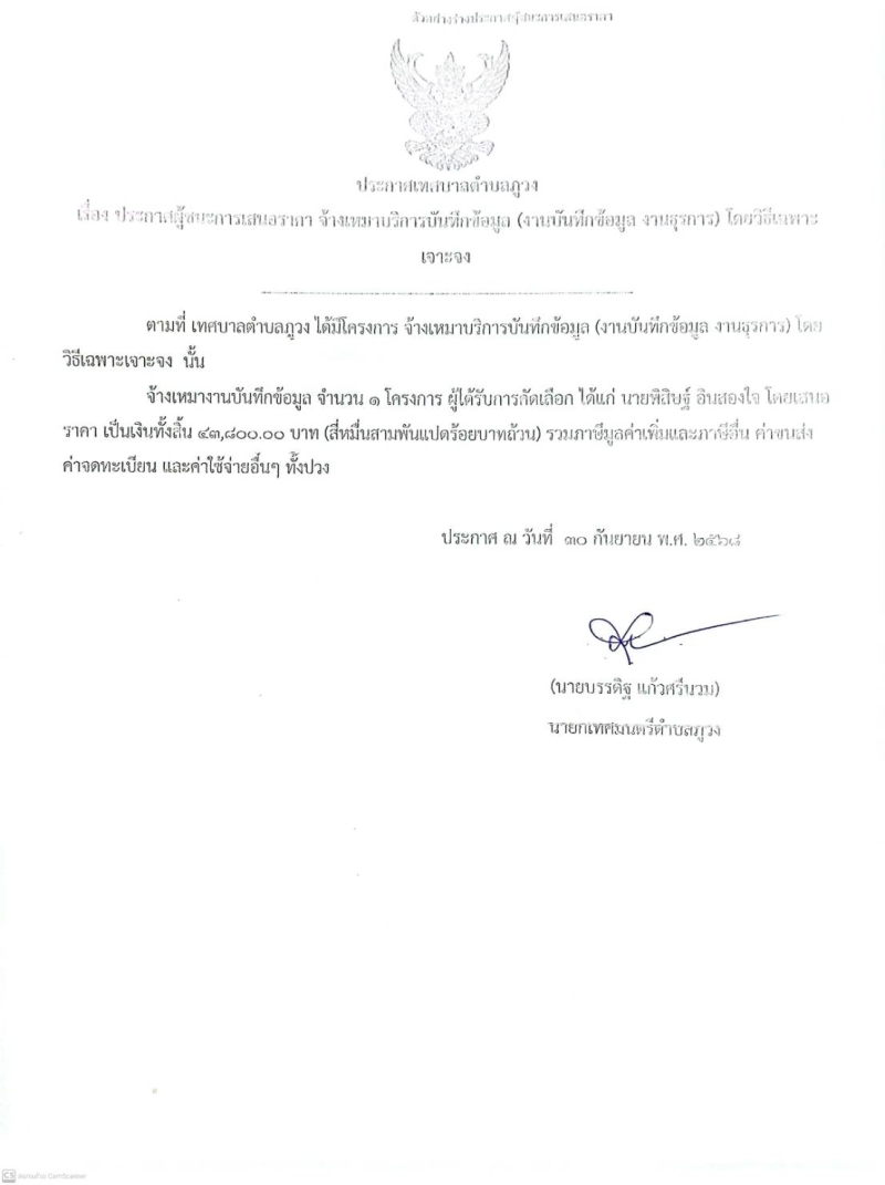 ประกาศผู้ชนะการเสนอราคา จ้างเหมาบริการบันทึกข้อมูล(งานบันทึกข้อมูล งานธุรการ)