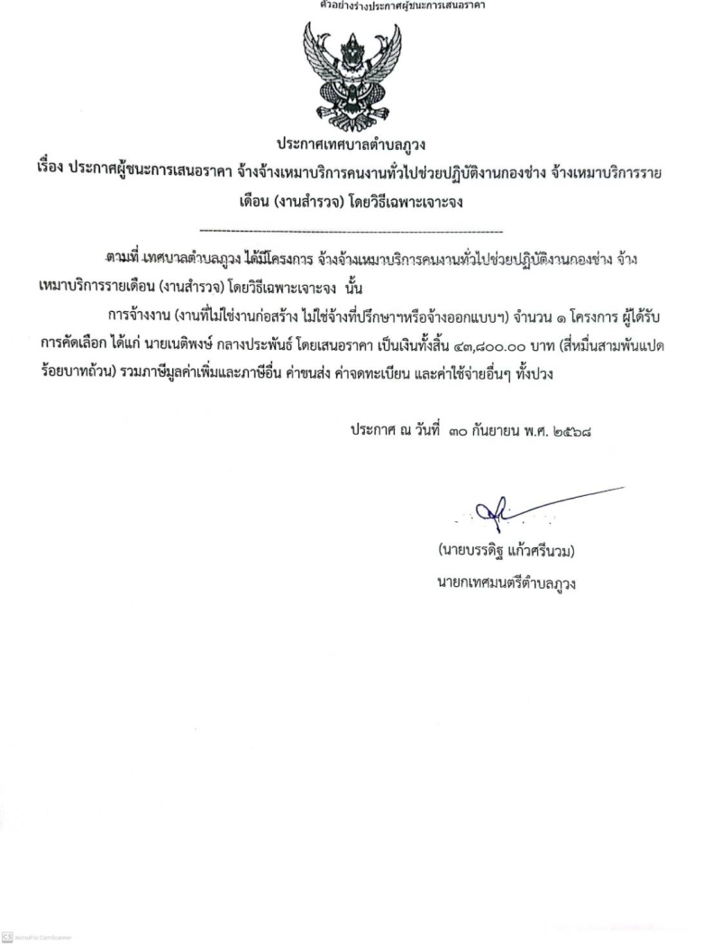 ประกาศผู้ชนะการเสนอราคา จ้างเหมาบริการคนงานทั่วไปช่วยปฏิบัติงานกองช่าง(งานสำรวจ)