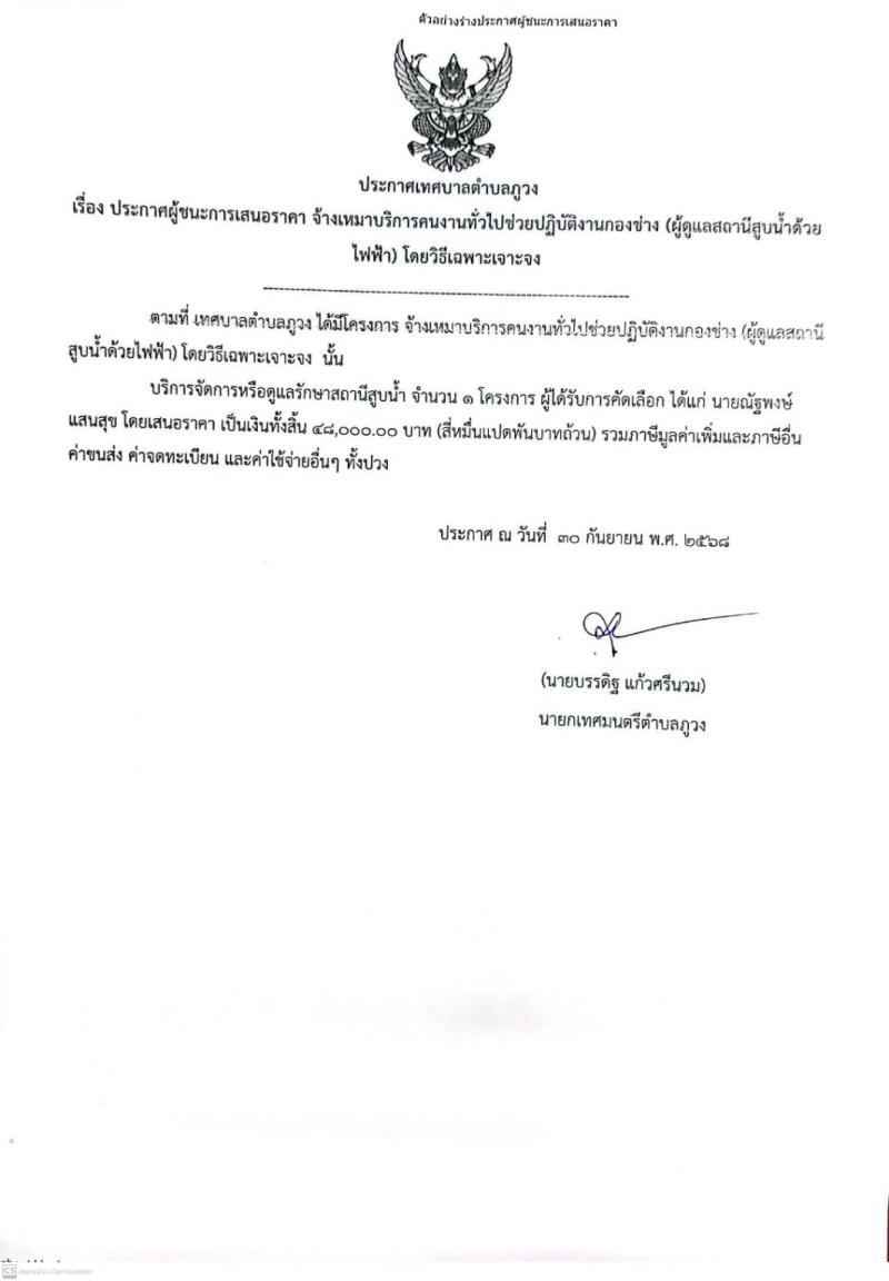 ประกาศผู้ชนะการเสนอราคา จ้างเหมาบริการคนงานทั่วไปช่วยปฏิบัติงานกองช่าง(ผู้ดูแลสถานีสูบน้ำด้วยไฟฟ้า)ม.2