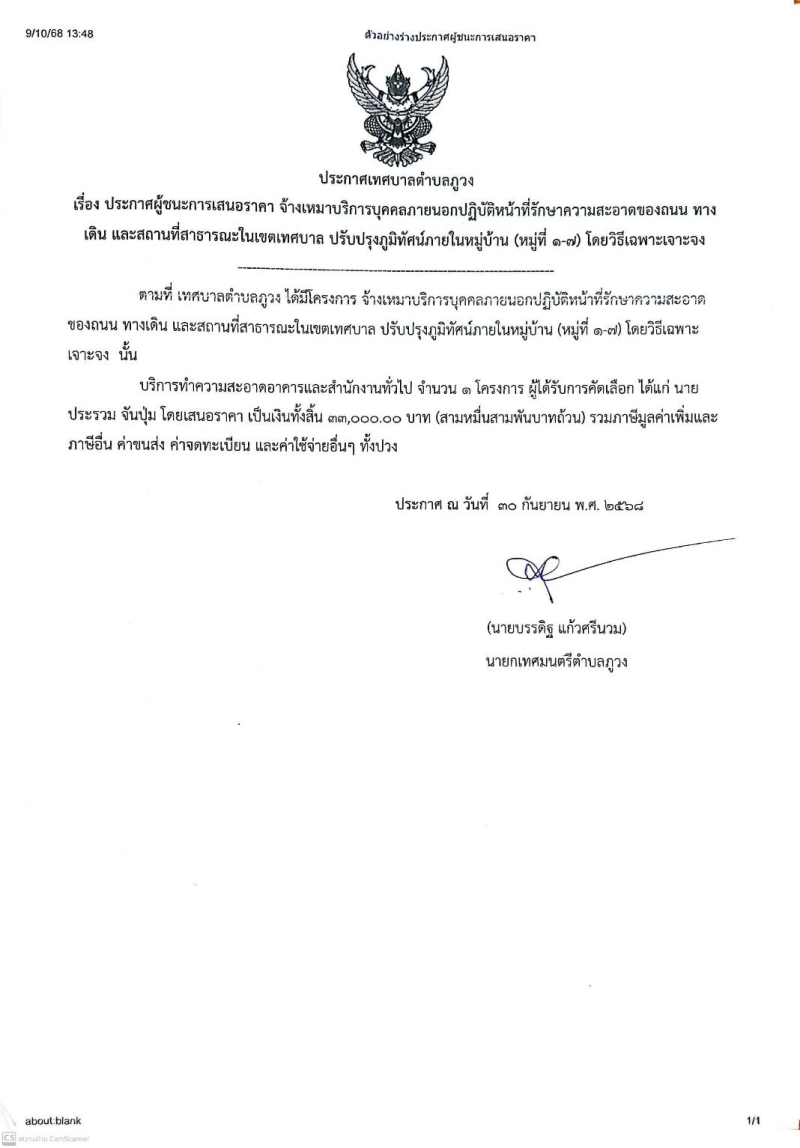 หัวข้อ :: ประกาศผู้ชนะการเสนอราคา จ้างเหมาบริการบุคคลภายนอกปฏิบัติหน้าที่รักษาความสะอาดของถนน ปรับปรุงภูมิทัศน์ภายในหมู่บ้าน (หมู่ที่1-7) นายประรวม จันปุ่ม