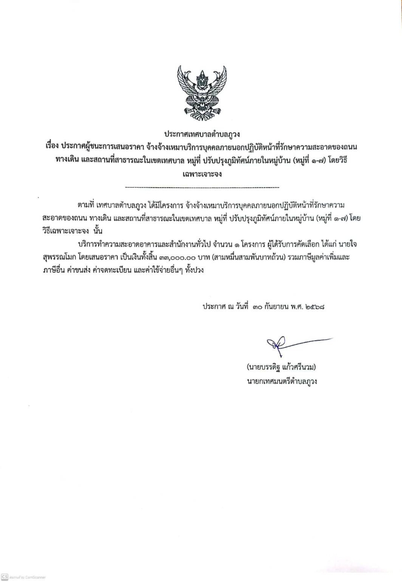 หัวข้อ :: ประกาศผู้ชนะการเสนอราคา จ้างเหมาบริการบุคคลภายนอกปฏิบัติหน้าที่รักษาความสะอาดของถนน ปรับปรุงภูมิทัศน์ภายในหมู่บ้าน (หมู่ที่1-7) นายใจ สุพรรณโมก