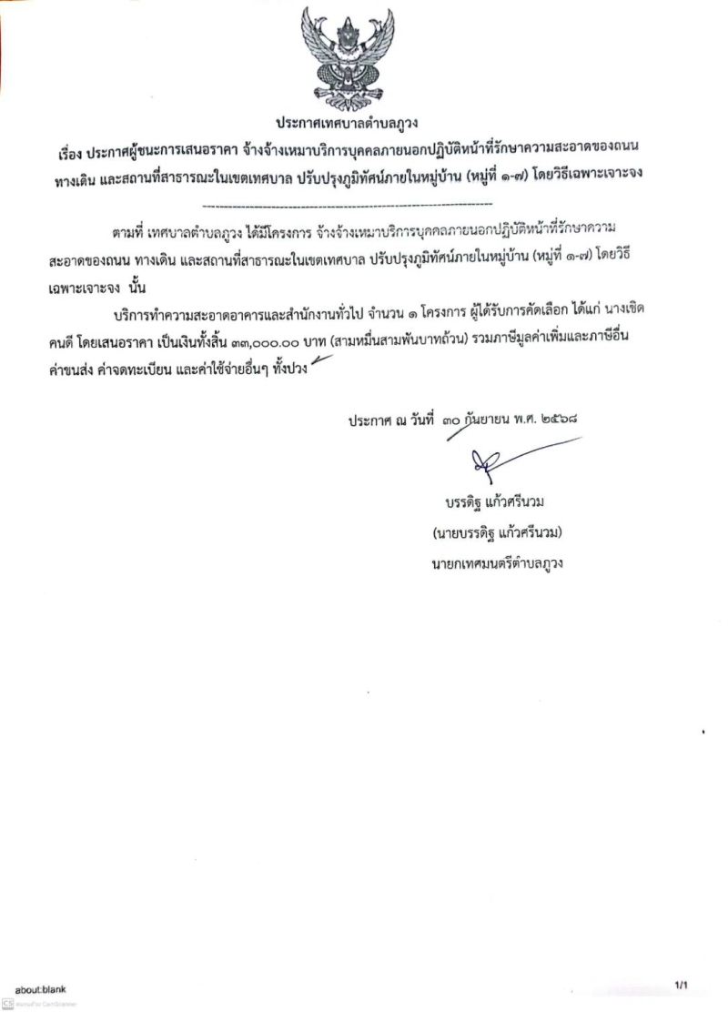 หัวข้อ :: ประกาศผู้ชนะการเสนอราคา จ้างเหมาบริการบุคคลภายนอกปฏิบัติหน้าที่รักษาความสะอาดของถนน ปรับปรุงภูมิทัศน์ภายในหมู่บ้าน (หมู่ที่1-7) นางเชิด คนดี