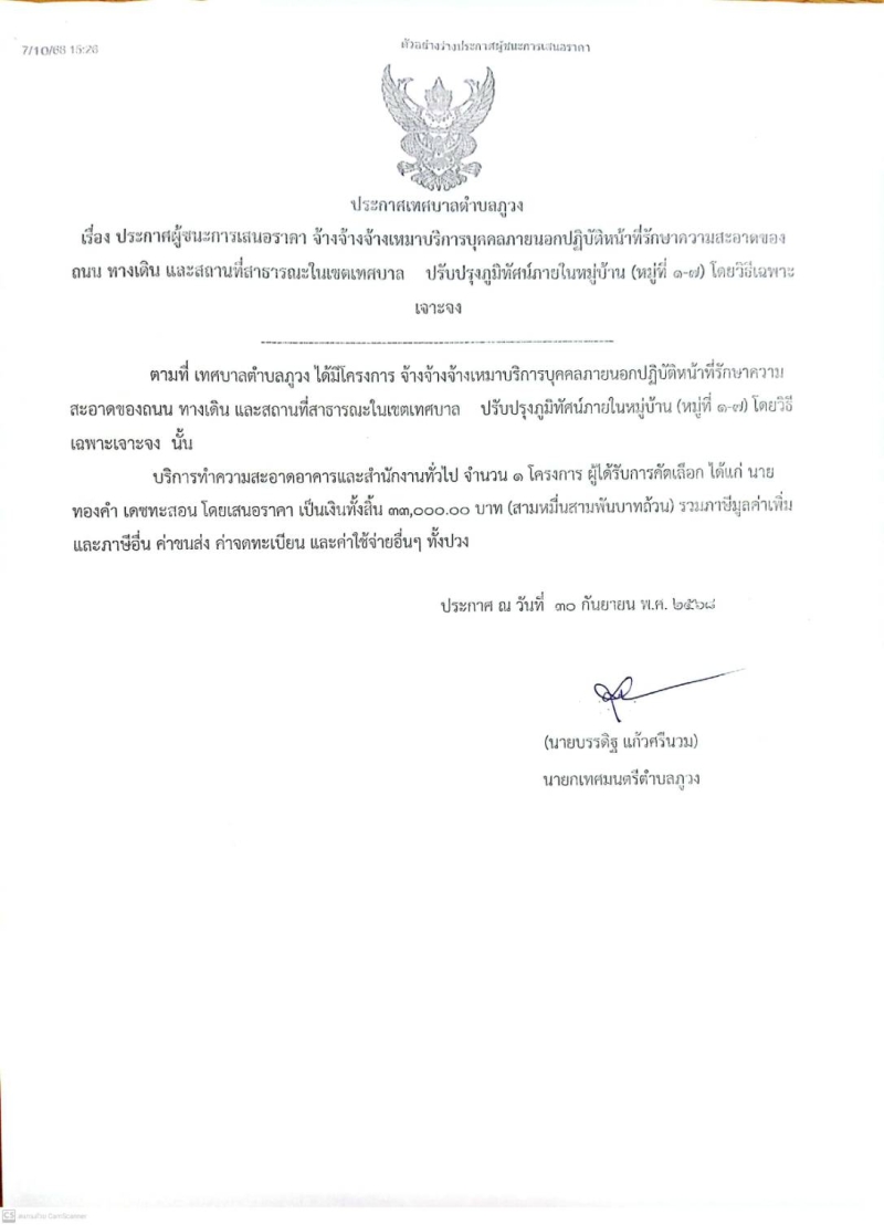 หัวข้อ :: ประกาศผู้ชนะการเสนอราคา จ้างเหมาบริการบุคคลภายนอกปฏิบัติหน้าที่รักษาความสะอาดของถนน ปรับปรุงภูมิทัศน์ภายในหมู่บ้าน (หมู่ที่1-7) นายทองคำ เดชทะสอน