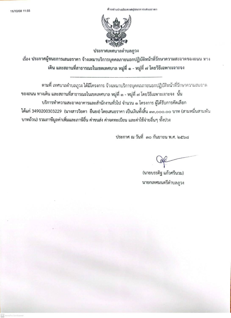 หัวข้อ :: ประกาศผู้ชนะการเสนอราคา จ้างเหมาบริการบุคคลภายนอกปฏิบัติหน้าที่รักษาความสะอาดของถนน ปรับปรุงภูมิทัศน์ภายในหมู่บ้าน (หมู่ที่1-7) นางสาววิยดา ยืนยง