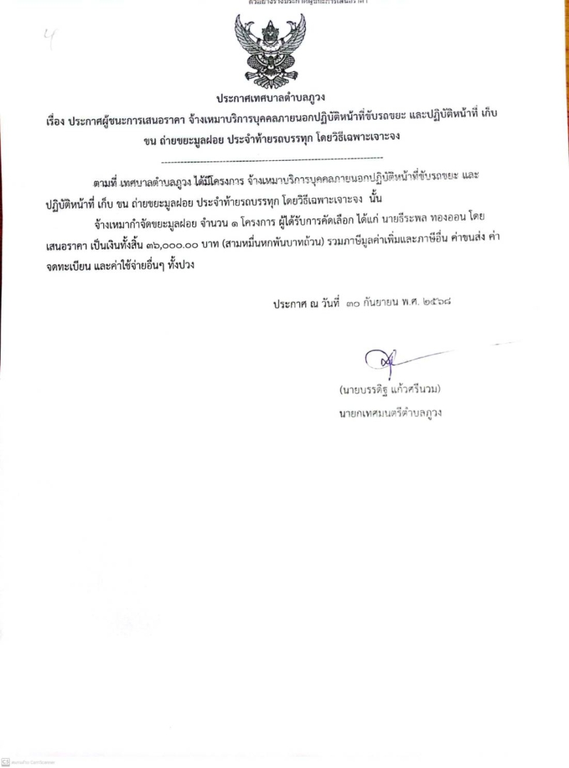 หัวข้อ :: ประกาศผู้ชนะการเสนอราคา จ้างเหมาบริการบุคคลภายนอกปฏิบัติงานขับรถบรรทุกขยะและปฏิบัติ หน้าที่ ขนถ่าย ขยะมูลฝอย ประจำท้ายรถบรรทุกขยะ นายธีระพล ทองออน