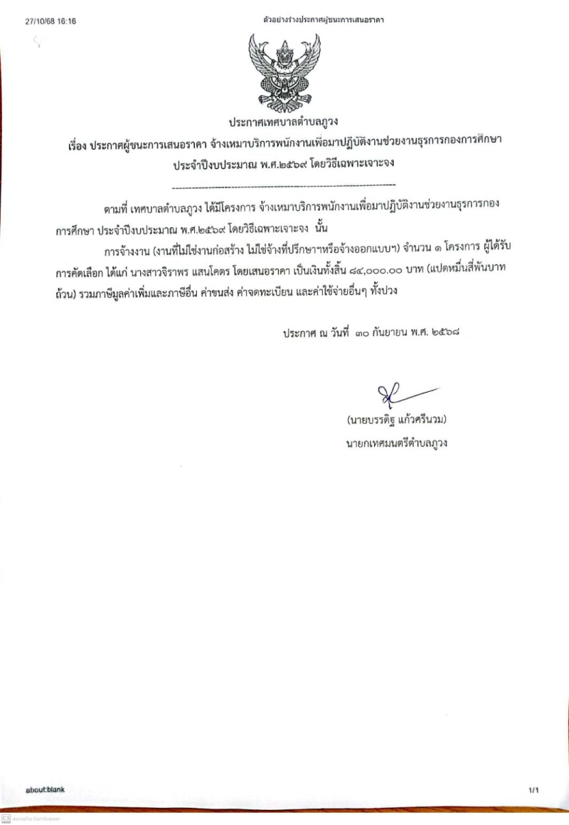 ประกาศผู้ชนะการเสนอราคา จ้างเหมาบริการพนักงานเพื่อมาปฏิบัติงานช่วยงานธุรการกองการศึกษา นางสาวจิราพร แสนโคตร