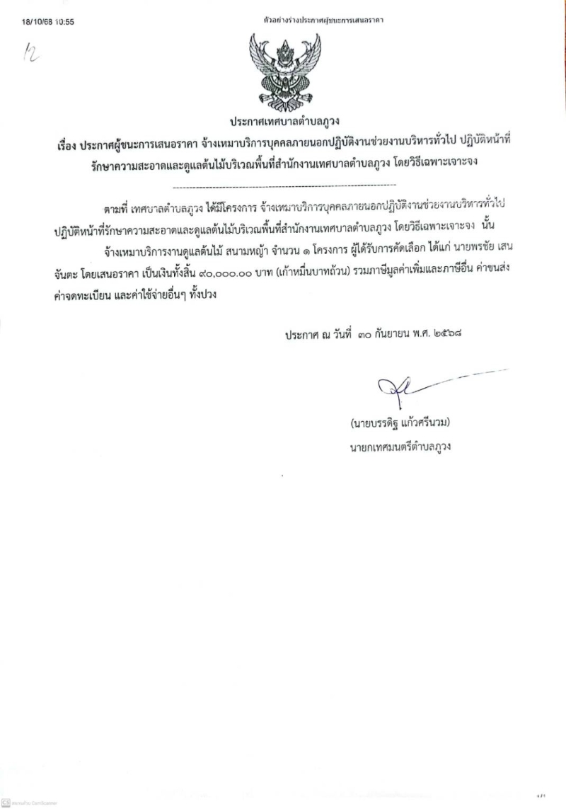 ประกาศผู้ชนะการเสนอราคา จ้างเหมาบริการบุคคลภายนอกปฏิบัติงานช่วยงานบริหารงานทั่วไป นายพรชัย เสนจันตะ