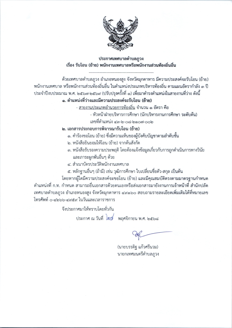 ประกาศ!!! รับโอน (ย้าย) พนักงานเทศบาลหรือพนักงานส่วนท้องถอื่น