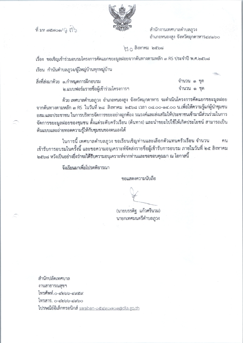 ขอเชิญเข้าร่วมอบรมโครงการคัดแยกขยะมูลฝอยจากต้นทางตามหลัก 3 Rs ประจำปี 2568