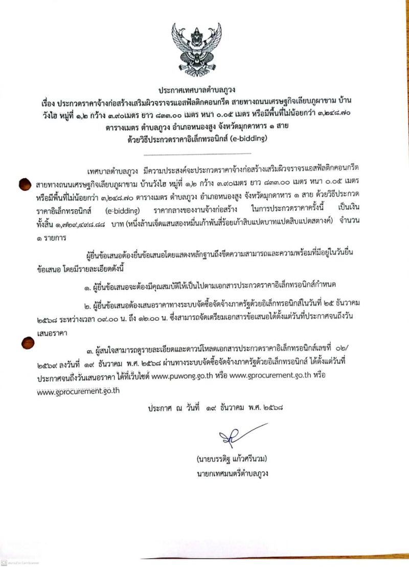 ประกาศประกวดราคาจ้างก่อสร้างเสริมผิวจราจรแอสฟัลติกคอนกรีต สายทางถนนเศรษฐกิจเลียบดูผาขาม บ้านวังไฮ หมู่ที่ ๑,๒