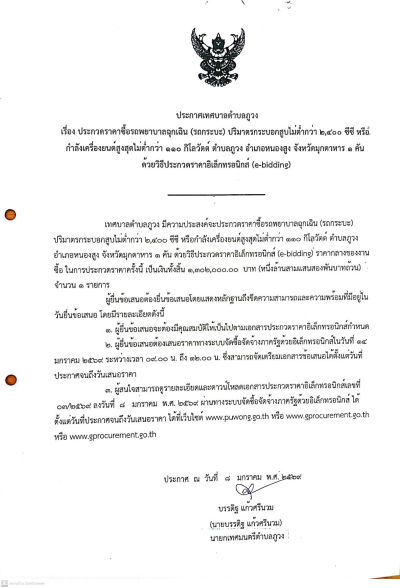 หัวข้อ :: ประกวดราคาซื้อรถพยาบาลฉุกเฉิน (รถกระบะ) ปริมาตรกระบอกสูบไม่ต่ำกว่า ๒,๔๐๐ ซีซี หรือ. กำลังเครื่องยนต์สูงสุดไม่ต่ำกว่า ๑๑๐๐ กิโถวัตต์ ตำบลภูวง อำเภอหนองสูง จังหวัดมุกดาหาร ๑ คัน ด้วยวิธีประกวดราคาอิเล็กทรอนิกส์ (e-bidding)
