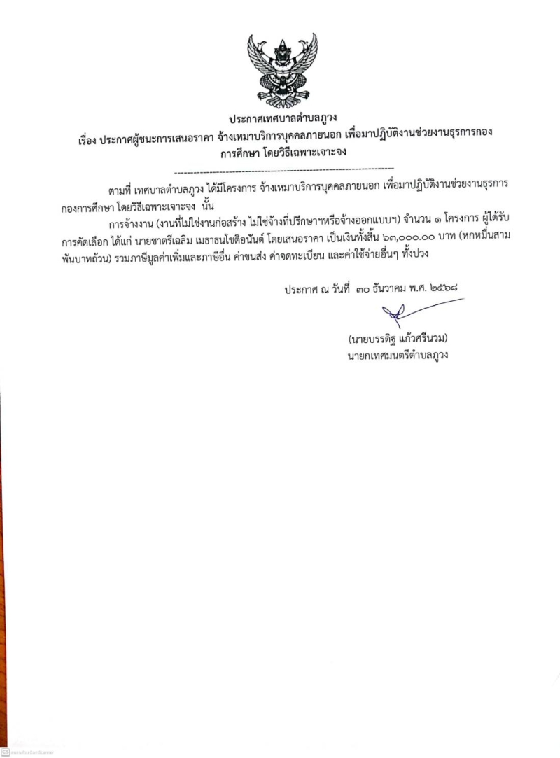 ประกาศผู้ชนะการเสนอราคา จ้างเหมาบริการบุคคลภายนอก เพื่อมาปฏิบัติงานช่วยงานธุรการกองการศึกษา