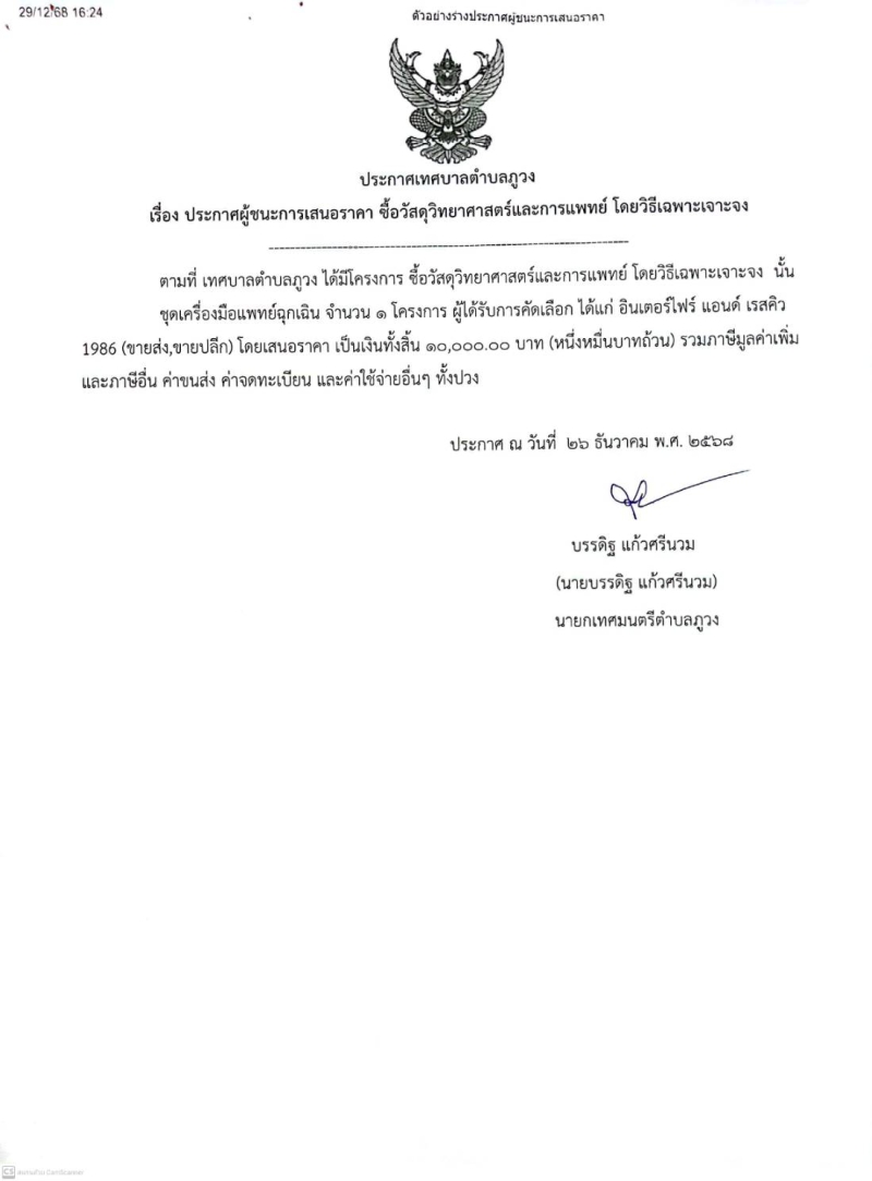 ประกาศผู้ชนะการเสนอราคา ซื้อวัสดุวิทยาสาสตร์และการแพทย์