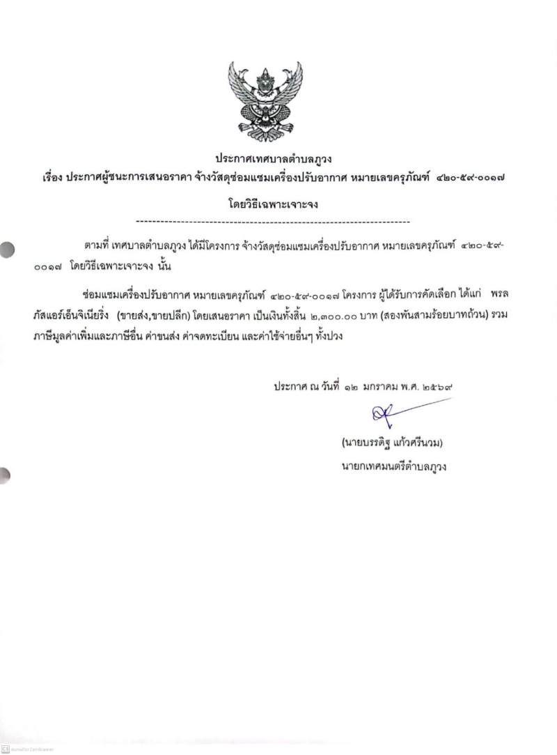 ประกาศผู้ชนะการเสนอราคา จ้างวัสดุซ่อมแซมเครื่องปรับอากาศ หมยเลขครุภัณฑ์