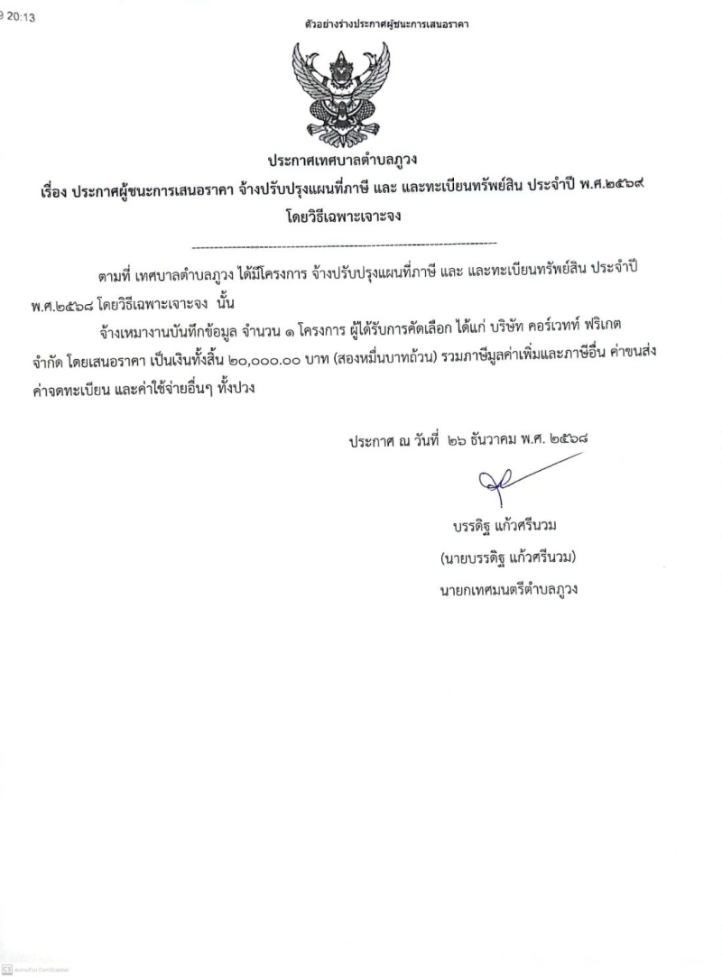 ประกาศผู้ชนะการเสนอราคา จ้างปรับปรุงแผนที่ภาษี และทรัพย์สิน ประจำปี พ.ศ.2569
