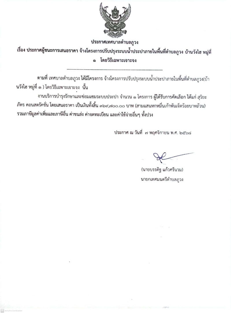 ประกาศผู้ชนะการเสนอราคา จ้างโครงการปรับปรุงระบบน้ำประปาภายในพื้นที่ตำบลภูวง หมู่ที่ 1