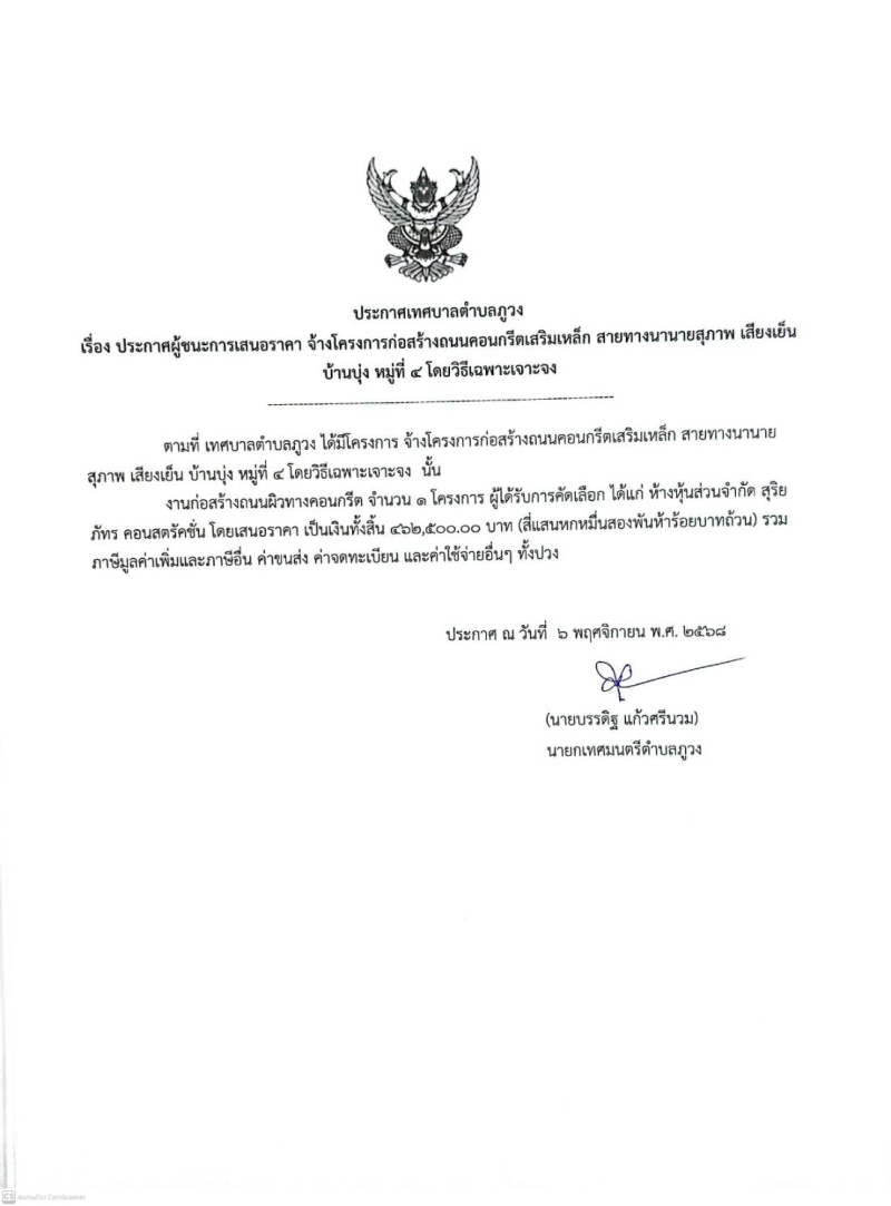 ประกาศผู้ชนะการเสนอราคา จ้างโครงการก่อสร้างถนนคอนกรีตเสริมเหล็ก สายทางนานายสุภาพ เสียงเย็น บ้านบุ่ง หมู่ที่ 4