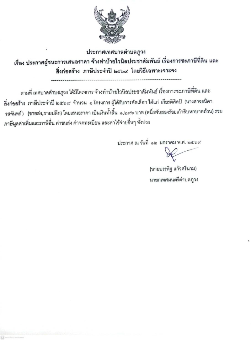 ประกาศผู้ชนะการเสนอราคา จ้างทำป้ายประจำปี 2569ไวนิลประชาสัมพันธ์ เรื่องการชำระภาษีที่ดิน และสิ่งก่อสร้าง ภาษี
