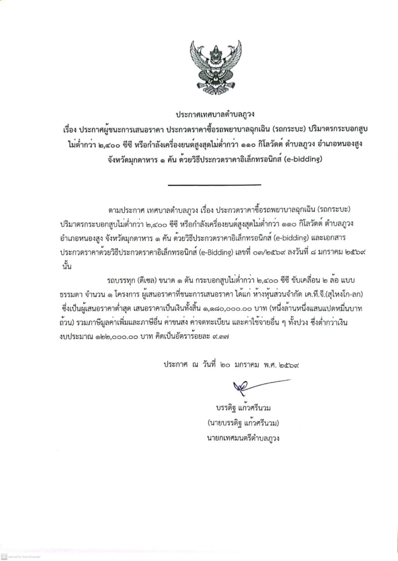 หัวข้อ :: ประกาศผู้ชนะการเสนอราคา ประกวดราคาซื้อรถพยาบาลฉุกเฉิน (รถกระบะ) ปริมาตรกระบอกสูบไม่ต่ำกว่า ๒,๔๐๐ ซีซี หรือ. กำลังเครื่องยนต์สูงสุดไม่ต่ำกว่า ๑๑๐ กิโลวัตต์ ตำบลภูวง อำเภอหนองสูง จังหวัดมุกดาหาร ๑ คัน ด้วยวิธีประกวดราคาอิเล็กทรอนิกส์ (e-bidding)