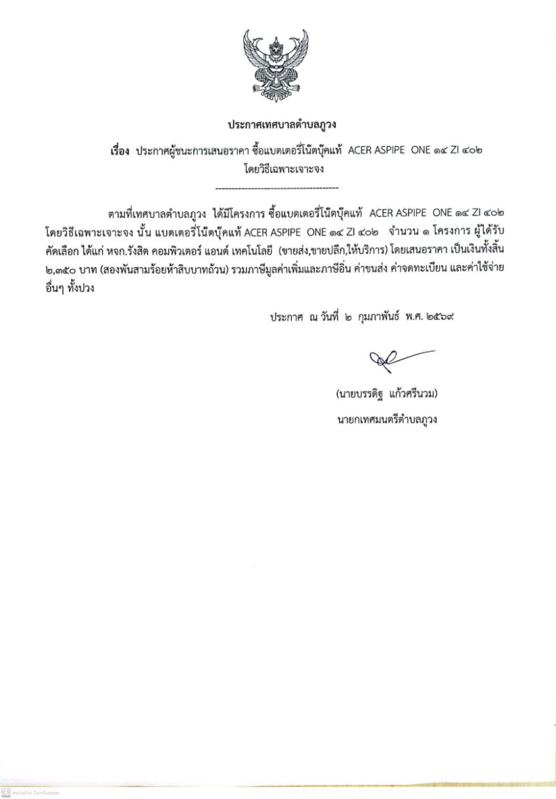 ประกาศผู้ชนะการเสนอราคา ซื้อแบตเตอรี่โน๊ตบุ๊ค ACER ASPIPE ONE 14 ZI 402