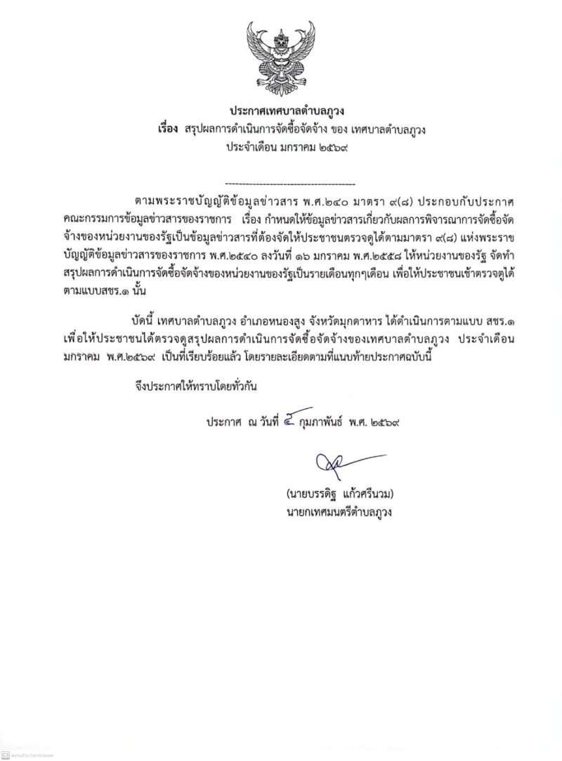 ประกาศผลการดำเนินการจัดซื้อจัดจ้างหน่วยงานของรัฐ ประจำเดือน มกราคม 2569